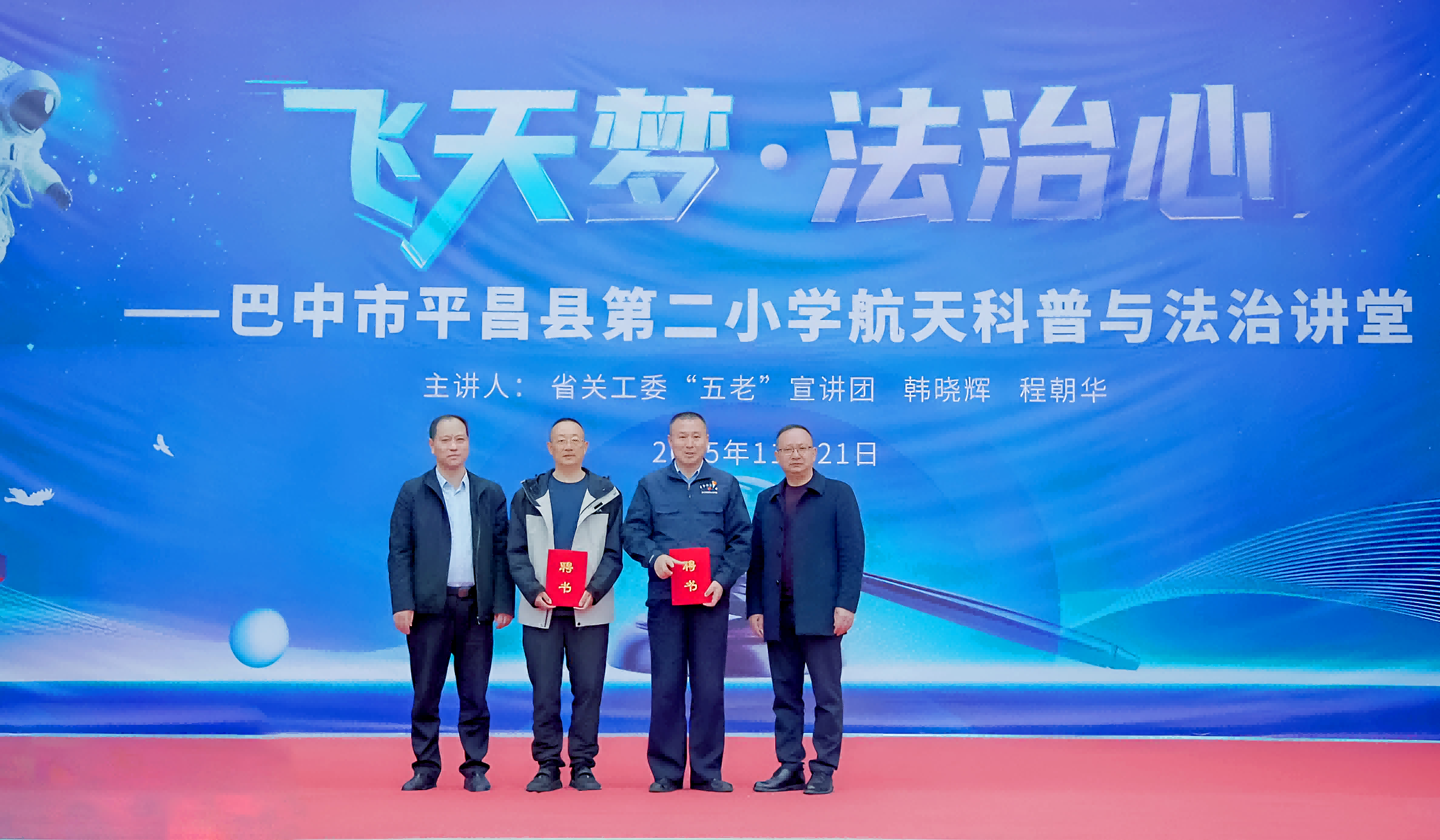 11月21日,为激发青少年科学兴趣,增强法治观念与民族自豪感,四川省彩运网“五老”宣讲团思想道德教育分团韩晓辉与法治宣传教育分团程朝华一道,携手走进巴中市平昌县第二小学校,联合开展以“飞天梦·法治心”......