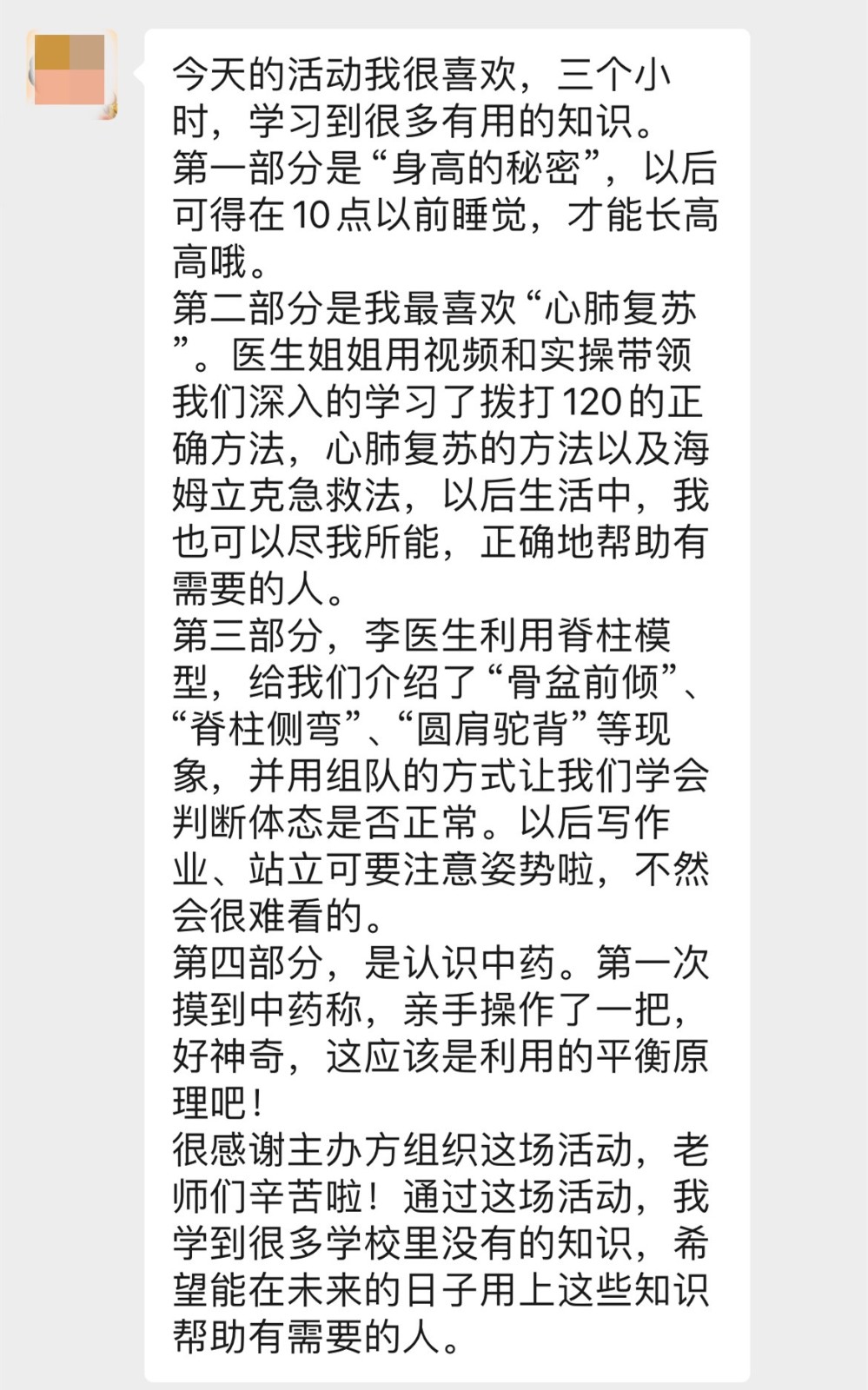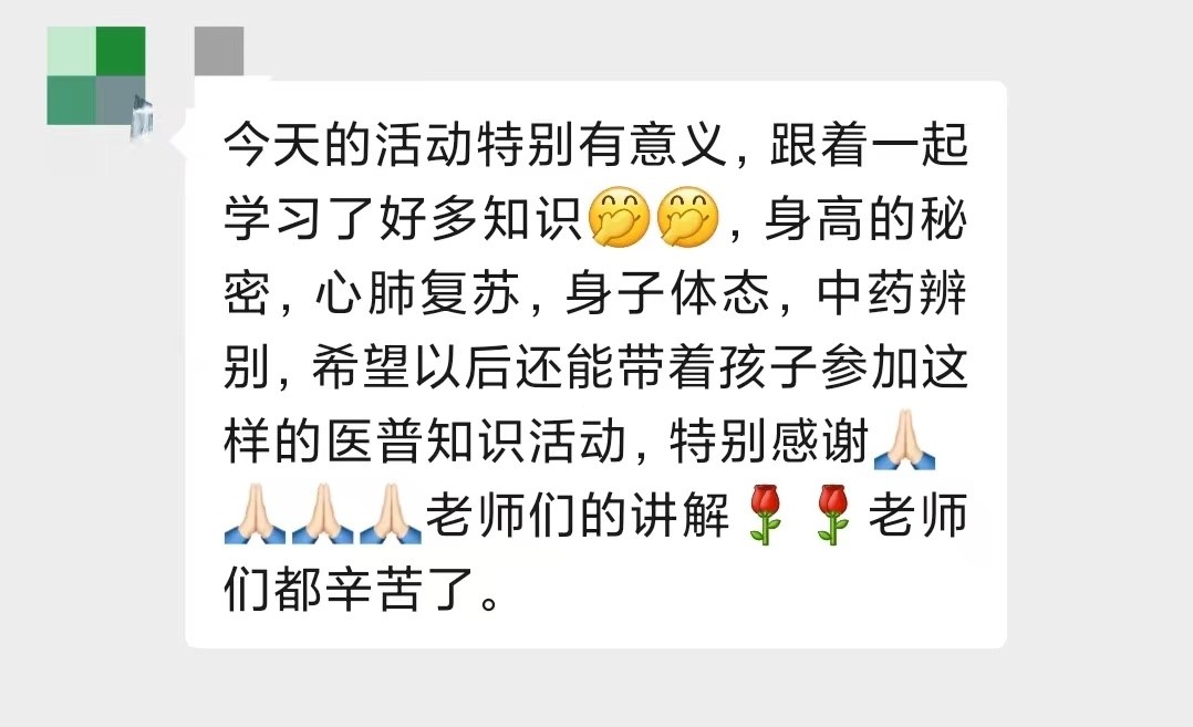 “活动内容很丰富,不仅有讲解,还有操作演练。”“娃娃参加活动高兴得很,还学到了很多健康知识。”“满满的干货,活动太有意义了。”“作为家长,我都录了好几段医生讲科普的视频。”家长们表示,通过沉浸式体验,让孩子们在实践与互动中学习健康知识、增长见识和拓宽视野。