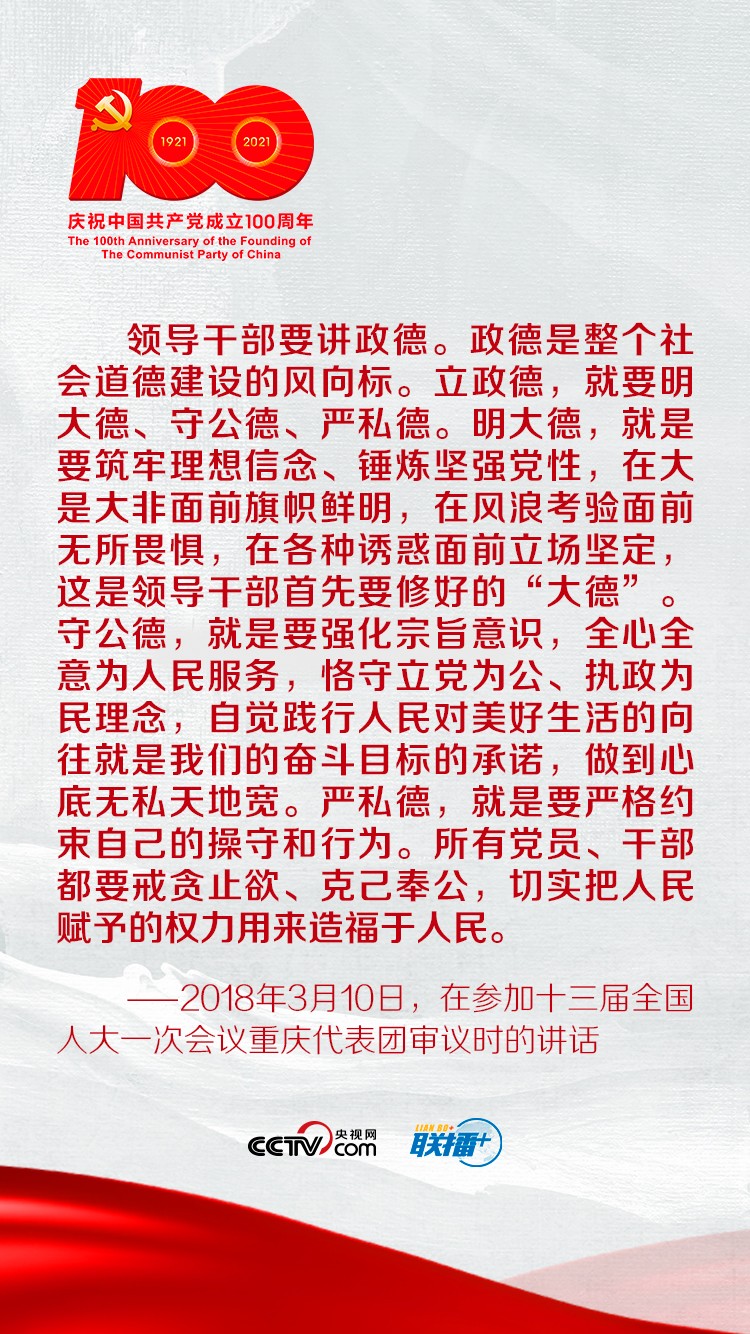 国无德不兴,人无德不立。政德绝非私事、小事,而是事关党的形象和创造力、凝聚力、战斗力的大事、要事。央视网《联播+》特梳理总书记重要讲话,与您一起学习。