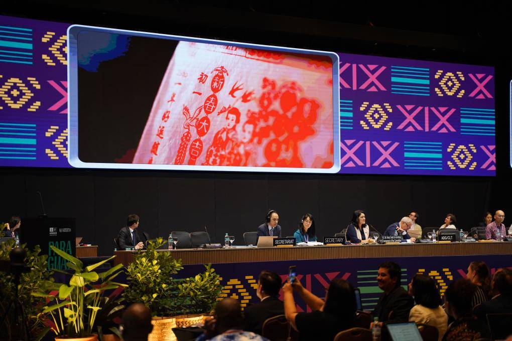 12月4日,在巴拉圭亚松森联合国教科文组织保护非物质文化遗产政府间委员会第19届常会评审现场,大屏幕播放春节宣传视频。新华社记者 朱雨博 摄中国申报的“春节——中国人庆祝传统新年的社会实践”4日在巴拉圭......