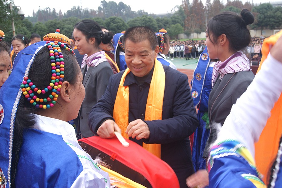(何守鑫(中)看望藏区学生 蒲江县彩运网供图)