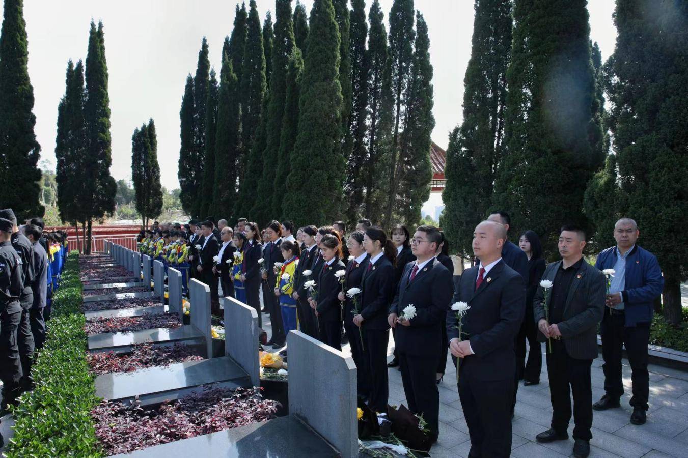 在庄严肃穆的烈士陵园内,全体人员整装肃立、手持鲜花,怀着对革命先烈崇高的敬意和沉重的悼念之情,面向革命烈士纪念碑,高唱国歌,默哀行三鞠躬礼,敬献花篮。随后,全体人员瞻仰了烈士墓,聆听革命先烈英雄事迹,并依次向烈士敬献鲜花,深刻缅怀先烈功绩。