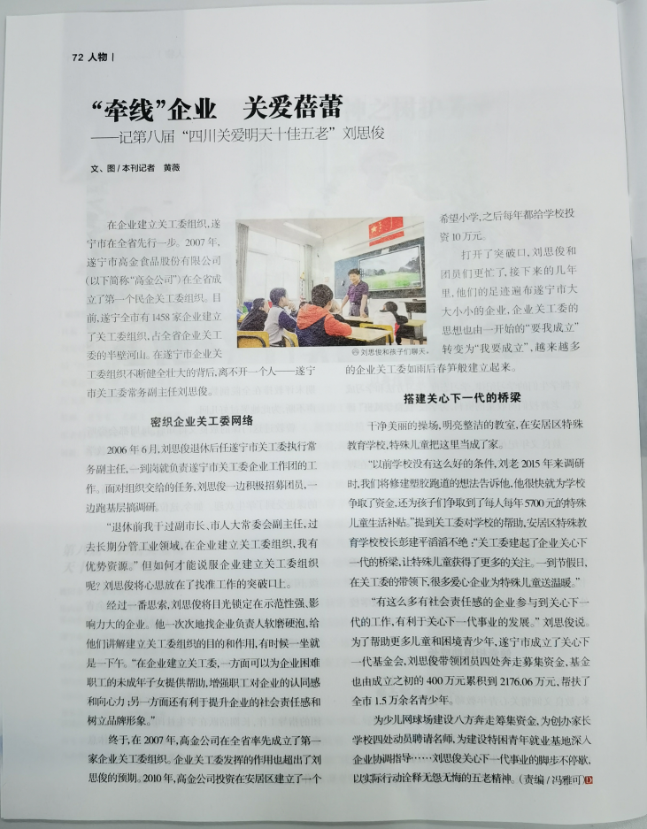 | 作品标题 | “牵线”企业 关爱蓓蕾 ——记第八届“四川关爱明天十佳五老”刘思俊 | 推荐单位 | 中国共产党四川省委员会《四川党的建设》杂志社 |